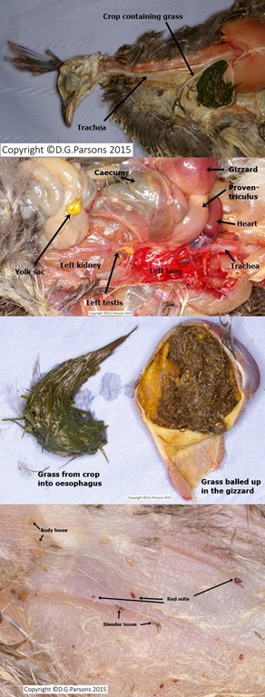 In this instance, alimentary canal blockage with grass in the crop and gizzard, red mite and lice. I would suspect that the red mite caused anaemia and debilitation which resulted in weakness and excessive consumption of grass which further compounded the weakness. Whilst the lice are unlikely to have caused death. They would most likely have caused irritation and sleep loss which would further have contributed to this birds demise. The picture below shows the lesions seen on post mortem.